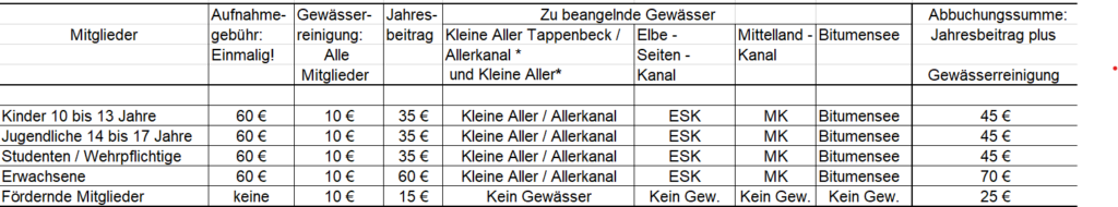 Hinweis: Die 10€ für die Gewässerreinigung werden mit dem Jahresbeitrag eingezogen. Bei Teilnahme an einem der mindestens 2 Arbeitseinsätze, die angeboten werden, werden die 10€ wieder erstattet.